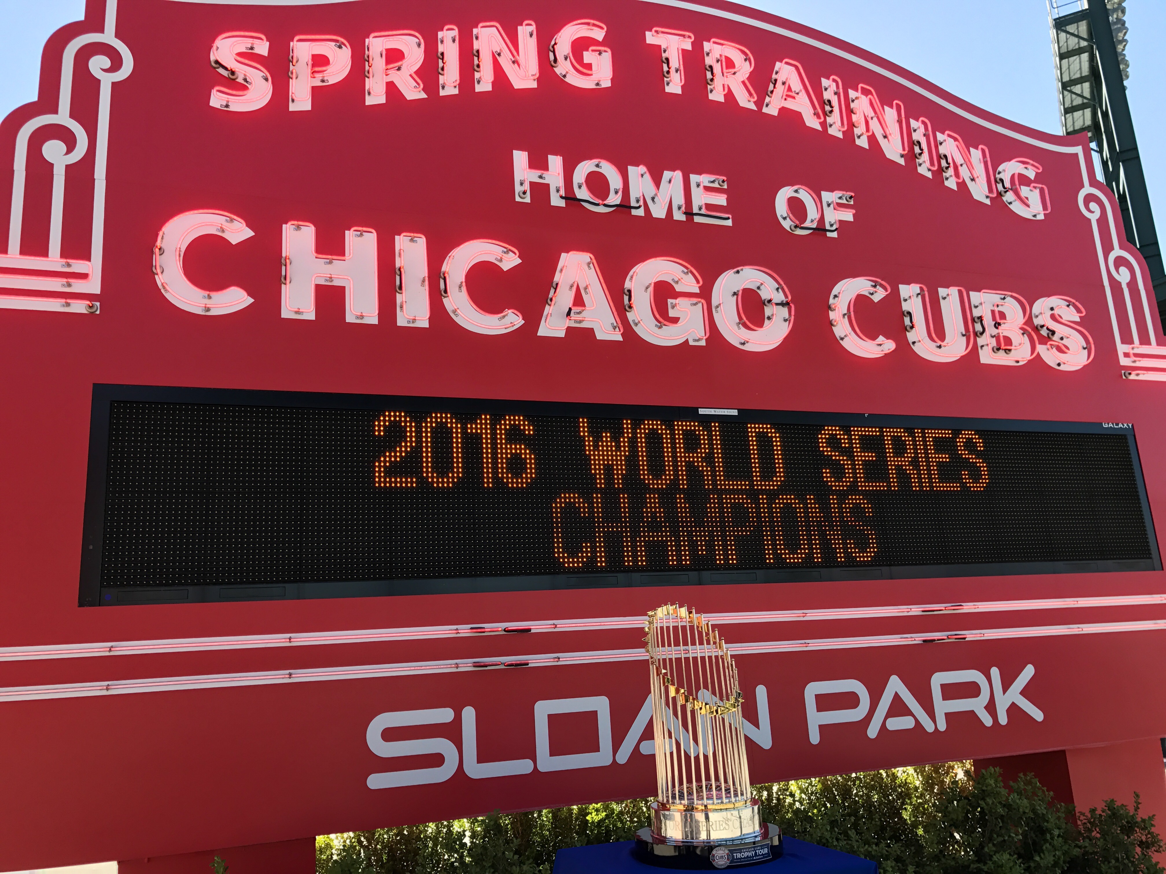Located near the first base gate, the large red Chicago Cubs sign is the ultimate photo op. A Sloan employee will temporarily display a personalized message at no charge for fans to have their picture taken.