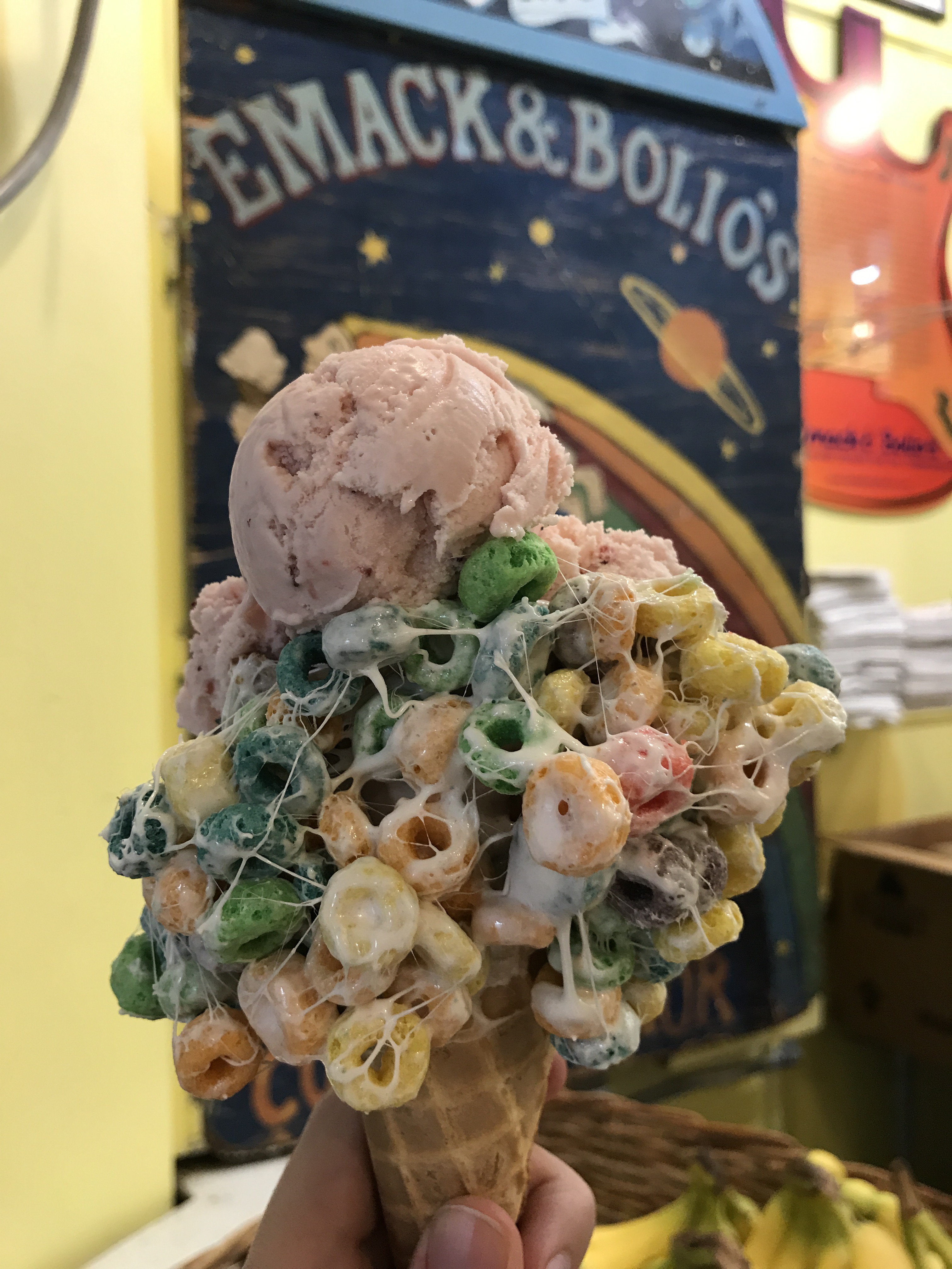 This. place. gets. me. Emack & Bolio’s slogan is “ice cream for the connoisseur.” First, let’s start with the ice cream itself. Handmade ice cream and unique flavors help to set this shop apart, like “deep purple” chip, peach, and maple walnut. Order it in as a shake, a cup, or (my favorite) a cone. But, not just any cone! Covered in melted marshmallow, the cones are then dipped in your choice of Oreos, Rice Krispies, Fruity Pebbles, and Fruit Loops.