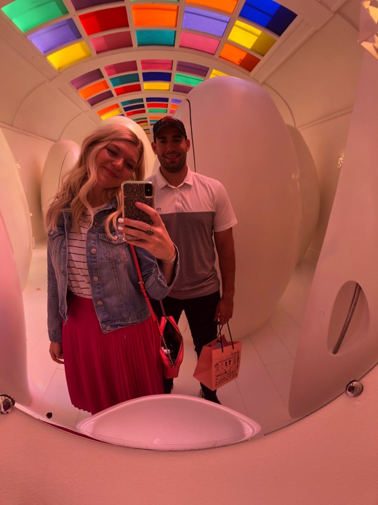 Also, how could we talk about Sketch without talking about their loos…egg-loos to be exact. A stark contrast from the pink velvet room where the tea is served, the white wall bathroom is full of individual toilets and finished off with a rainbow tile ceiling. On the outside, the individual loos resemble eggs, hence the name egg-loo. On the inside, they mimic nicer versions of portable toilets. Overall, the whole experience was unlike anything I’ve ever seen or done.