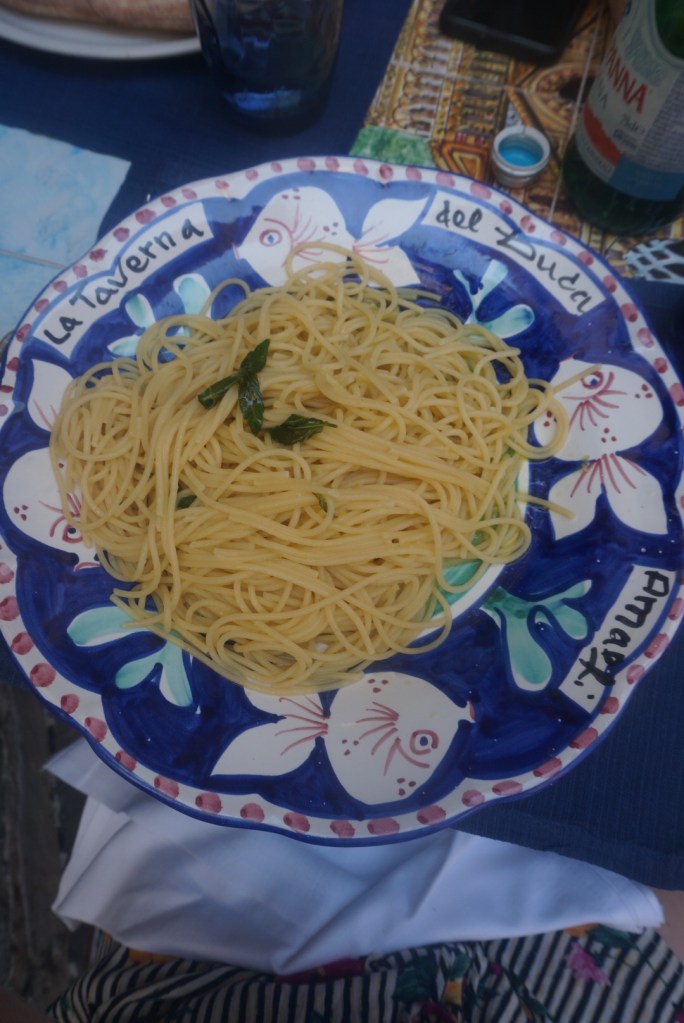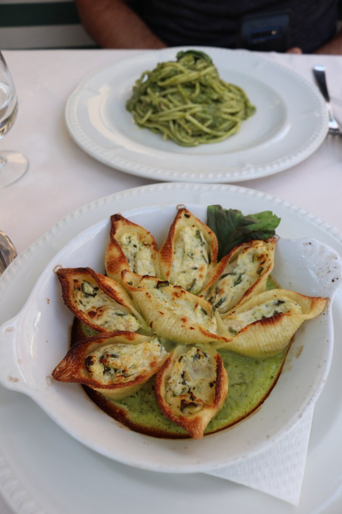 When we arrived in Positano, it was lunch time and we were hungry! Luckily, our hotel had its own restaurant– as do most of the hotels. Since we were in the land of lemons, I had to try the lemon and pesto ricotta shells and lemon sorbet. Rob had a pesto pasta that was equally as tasty.