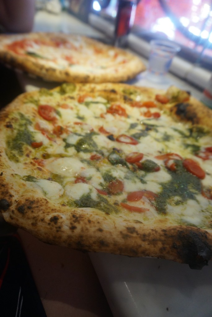 Once we ordered, the pizza didn’t take much longer than our original wait time outside (which must be the key to turning over tables rapidly). We ordered a traditional margarita and one with pesto. Each pizza was large, but the crust was quite thin. So, we had no trouble finishing every bite.