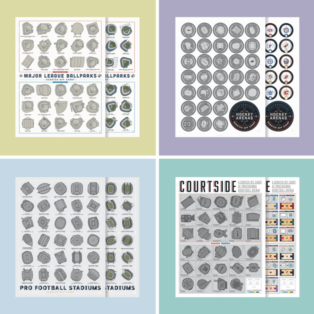 15. Stadium scratch off prints- Keep track of sports wanderlust with these scratch off prints, which come in MLB parks, NHL arenas, NFL stadiums, and NBA arenas. (Pop Chart, $25 or $85 for set)