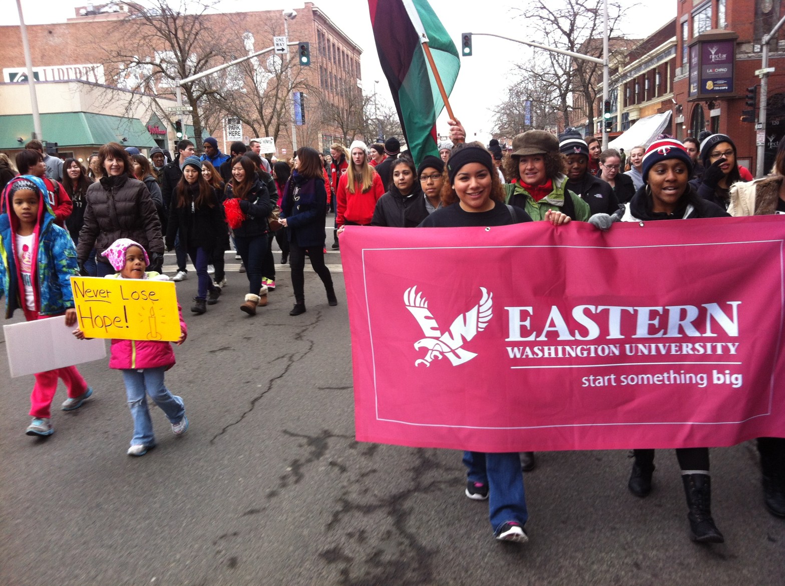 Fifty years after Martin Luther King Jr. gave his “I Have a Dream” speech, students gathered in downtown Spokane to celebrate him and answer the question, “What are you doing for others?” On Jan. 20, about 100 Eastern students joined thousands of community and civic group members who took part in the annual Martin LutherContinueContinue reading “Community marches on Main Street”